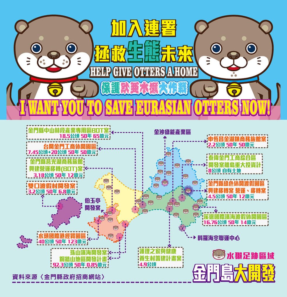 起因於2013年浯江溪口填土事件引爆12件未公開BOT案,因大半涉及歐亞水獺棲地,於是有水獺保育連署