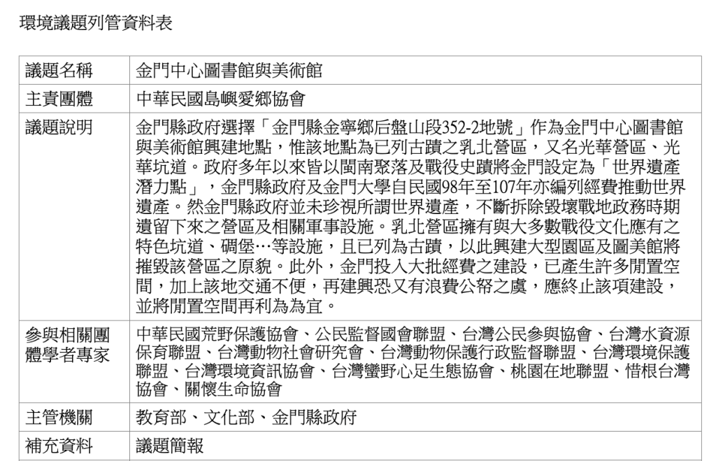 • 後續:因圖美館興建地點在乳山營區外圍,經台灣公民參與協會判定與本會質疑會破壞營區之訴求不符,不予列管